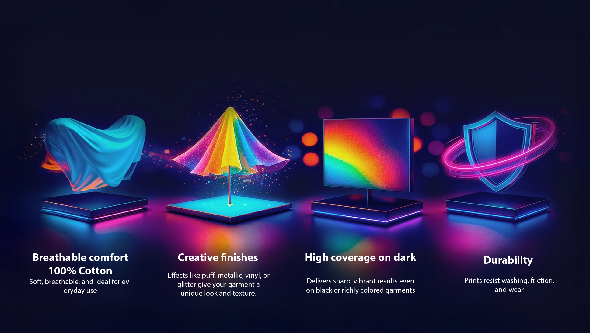 Screen printing is highly recommended for its excellent durabiliyand professional finish. It’s perfect for powerful phrases, solidlogos, and standout designs.